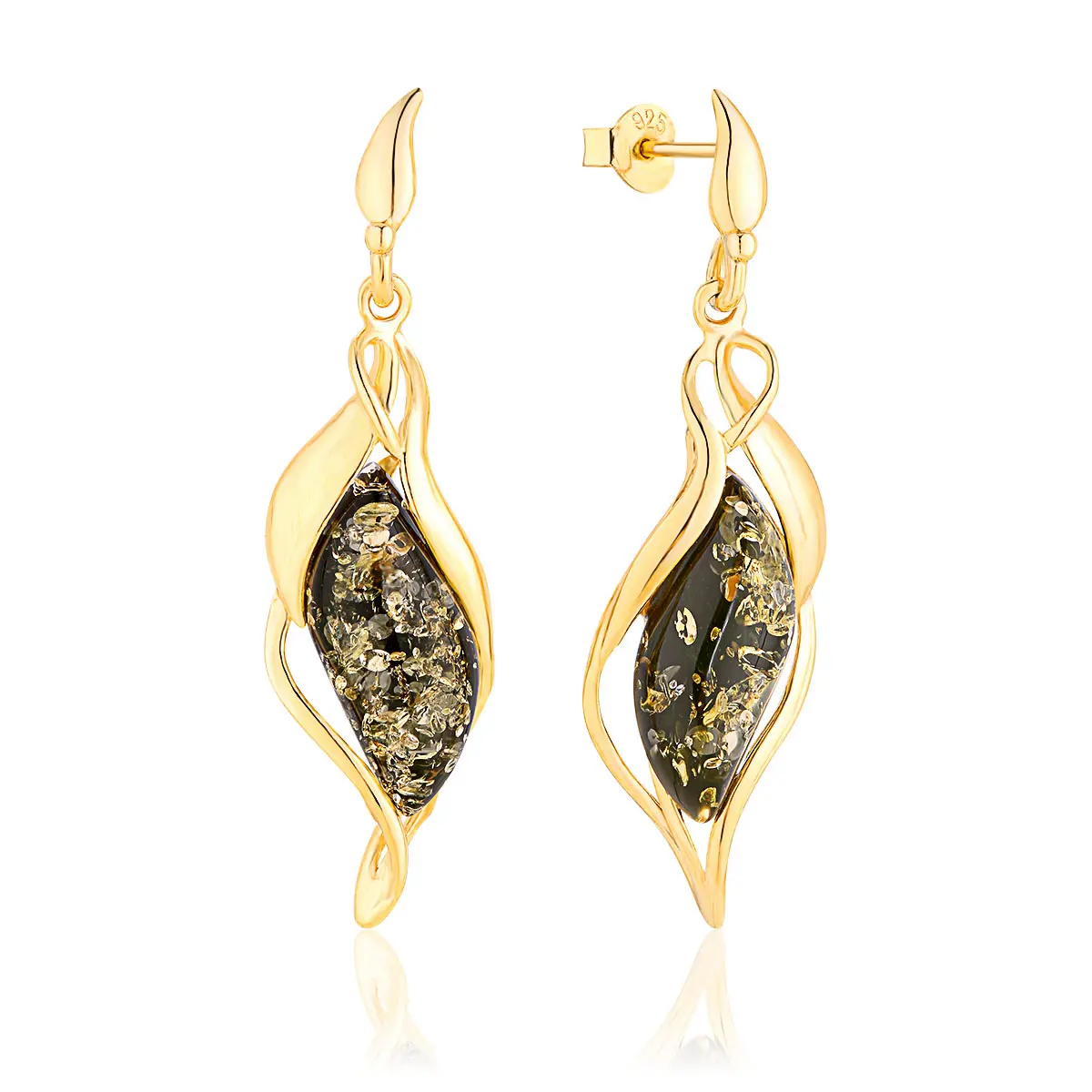 Kolczyki srebrne pozłacane markizy z zielonym bursztynem