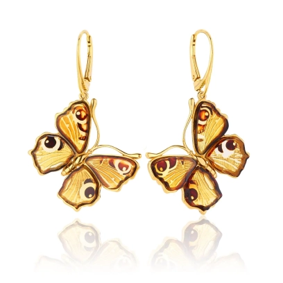 Kolczyki srebrne pozłacane motyle z bursztynem Big Butterfly Love