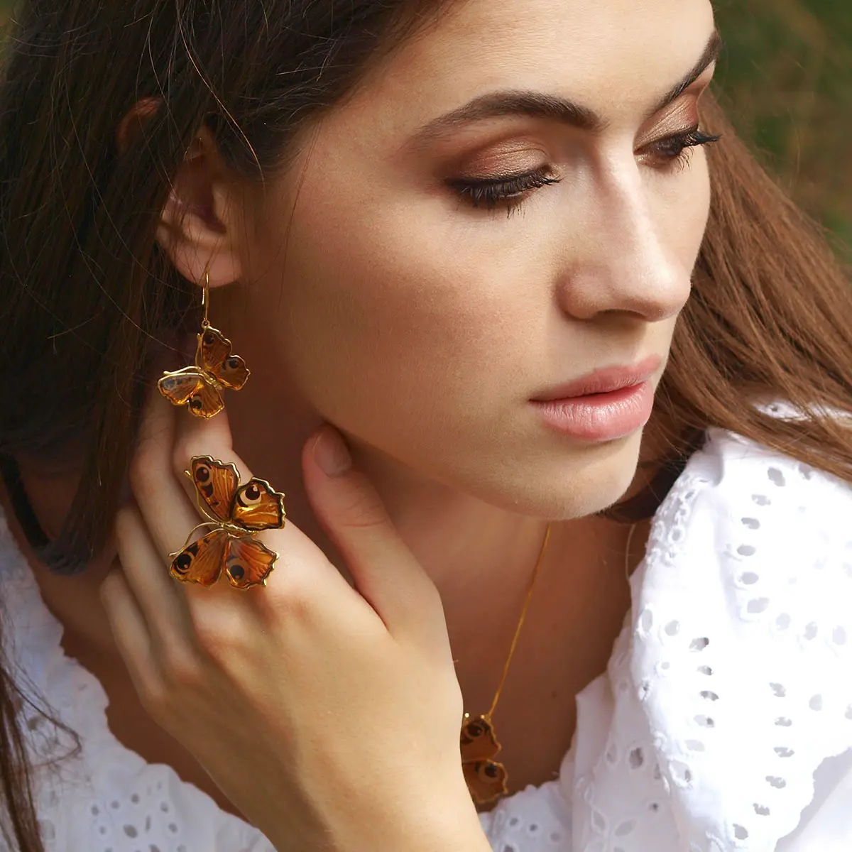 Kolczyki Big Butterfly Love to pozłacane ozdoby do uszu, które stanowią niecodzienny dodatek. Kolczyki zjawiskowo kołyszą się wokół twarzy, ich kolory podkreślają oczy i karnację właścicieli. Wydaje się, że motyle są prawdziwe! To za sprawą tak realnego nawiązania do jednego z najbardziej znanych motyli, jakim jest rusałka pawik. Skrzydła rusałki są brązowo-czerwone. Charakterystyczne są na ich końcach plamki, które wyglądają jak oczy. Dzięki naturalnemu bursztynowi, z którego zostały stworzone, w tych ozdobach wyglądają identycznie!