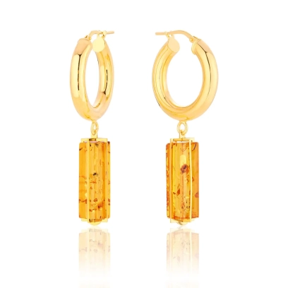 Kolczyki wiszące zapinane srebrne pozłacane z koniakowym bursztynem Mikro