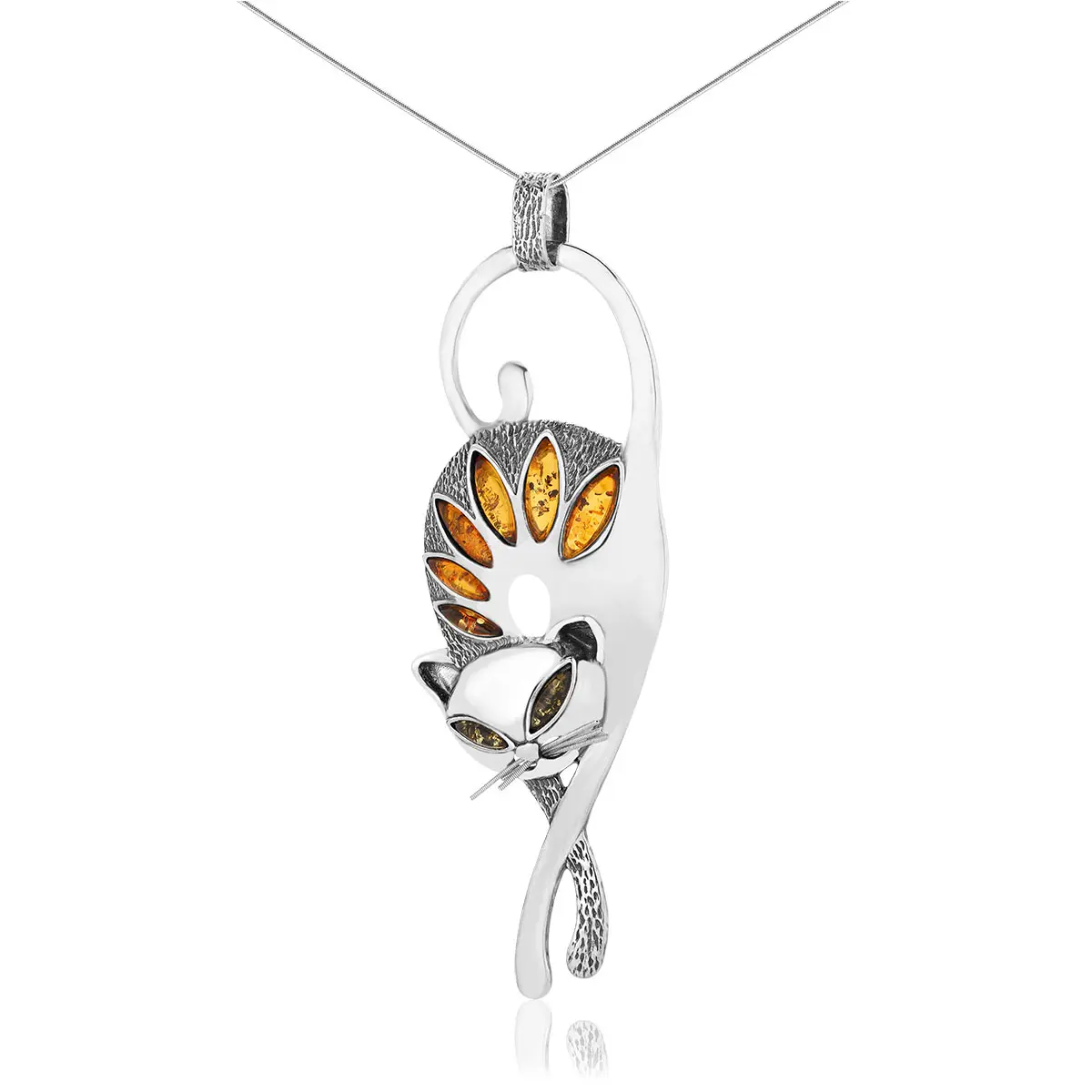 Zawieszka srebrna kot z koniakowym bursztynem Cat