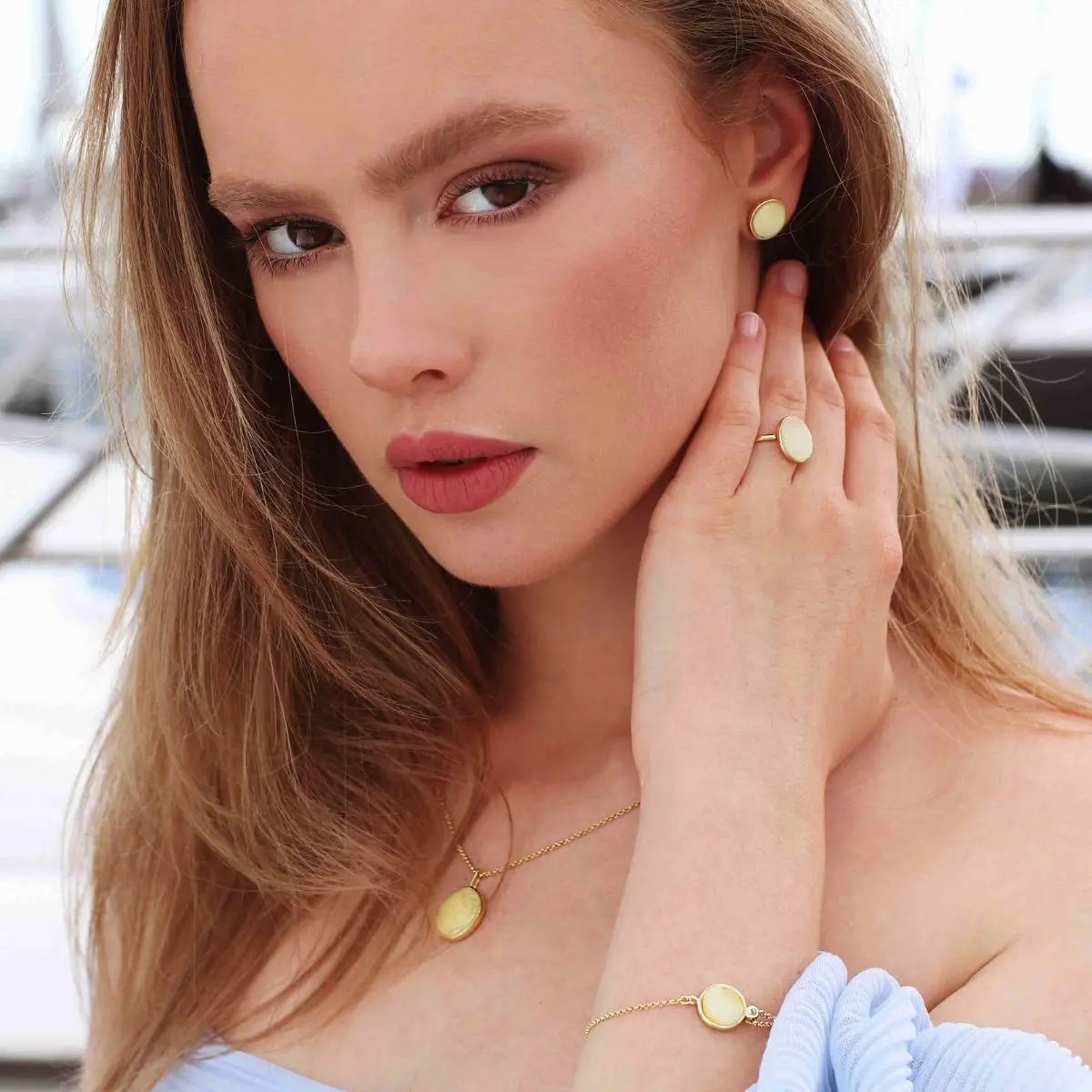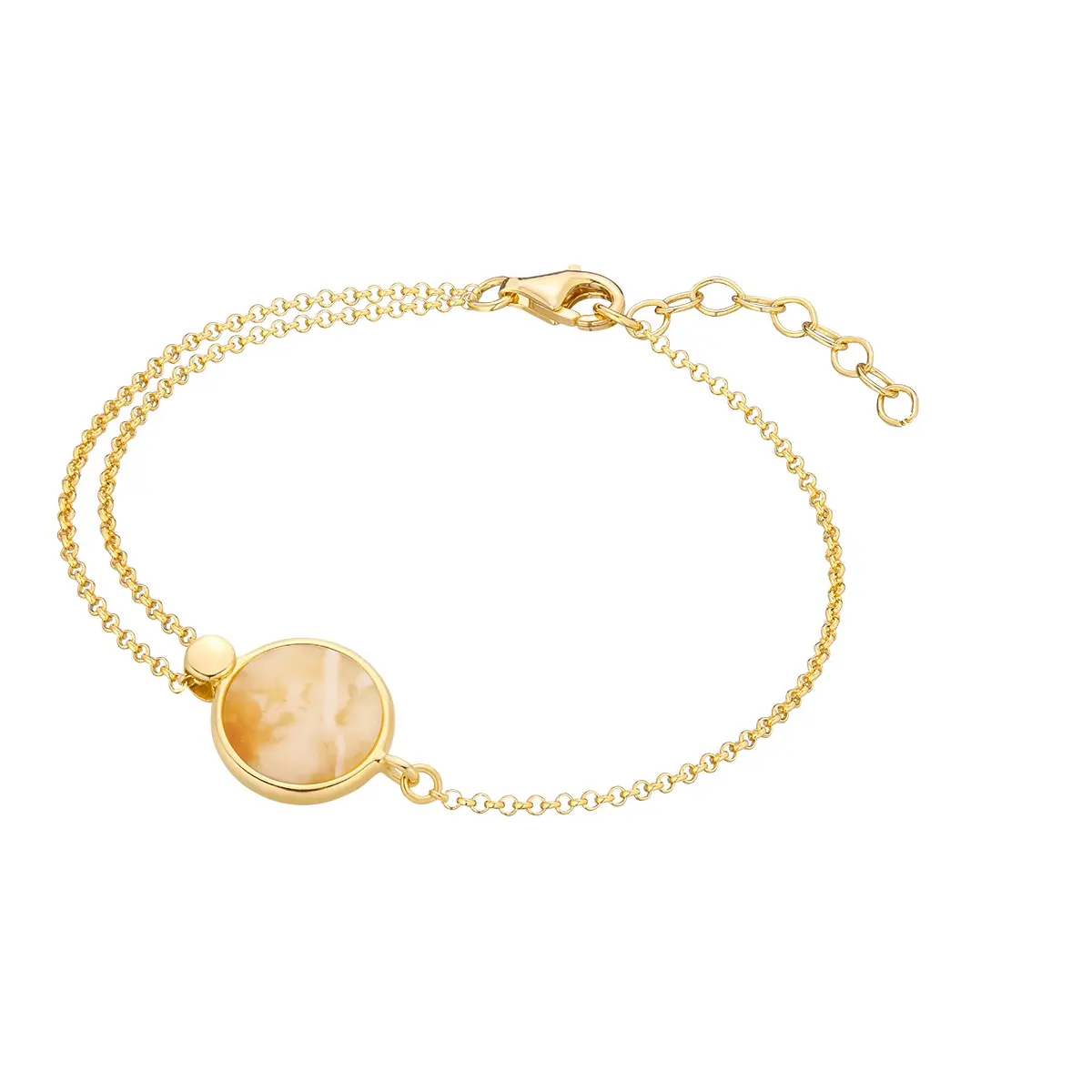 Bransoletka srebrna, pozłacana z bursztynem ozdobi rękę kobiety, która lubi minimalizm i ponad wszystko ceni naturę. Bursztyn to skamieniała żywica drzew iglastych tworzona na przestrzeni około 50 mln lat. Symbol szczęścia, zdrowia i płodności. Osadzony w delikatnej ramce bursztyn w kolorze mlecznym stanowi główny element tej delikatnej biżuterii. Projektanci zadbali o najdrobniejszy szczegół, bowiem bursztyn przytrzymują asymetrycznie dopięte delikatne łańcuszki, tworząc wyjątkowa bransoletkę, która pięknie podkreśli kobiecy opalony nadgarstek. Bursztynową bransoletkę możesz uzupełnić naszyjnikiem lub kolczykami z tej samej kolekcji.