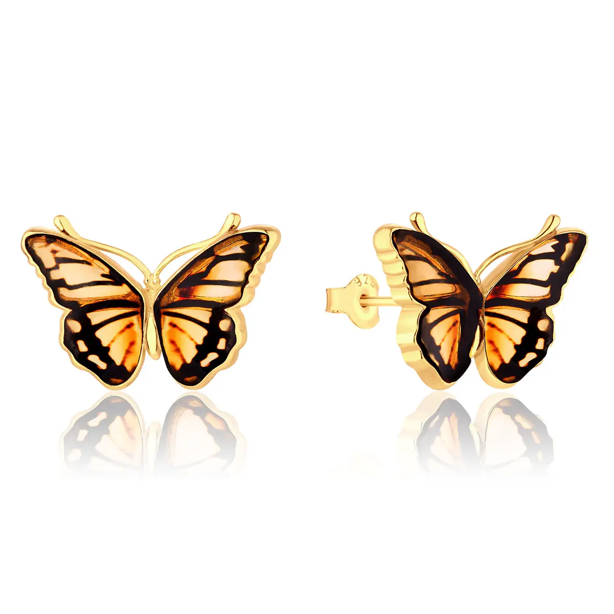 Kolczyki na sztyft srebrne pozłacane motyle z bursztynem Butterfly Kiss