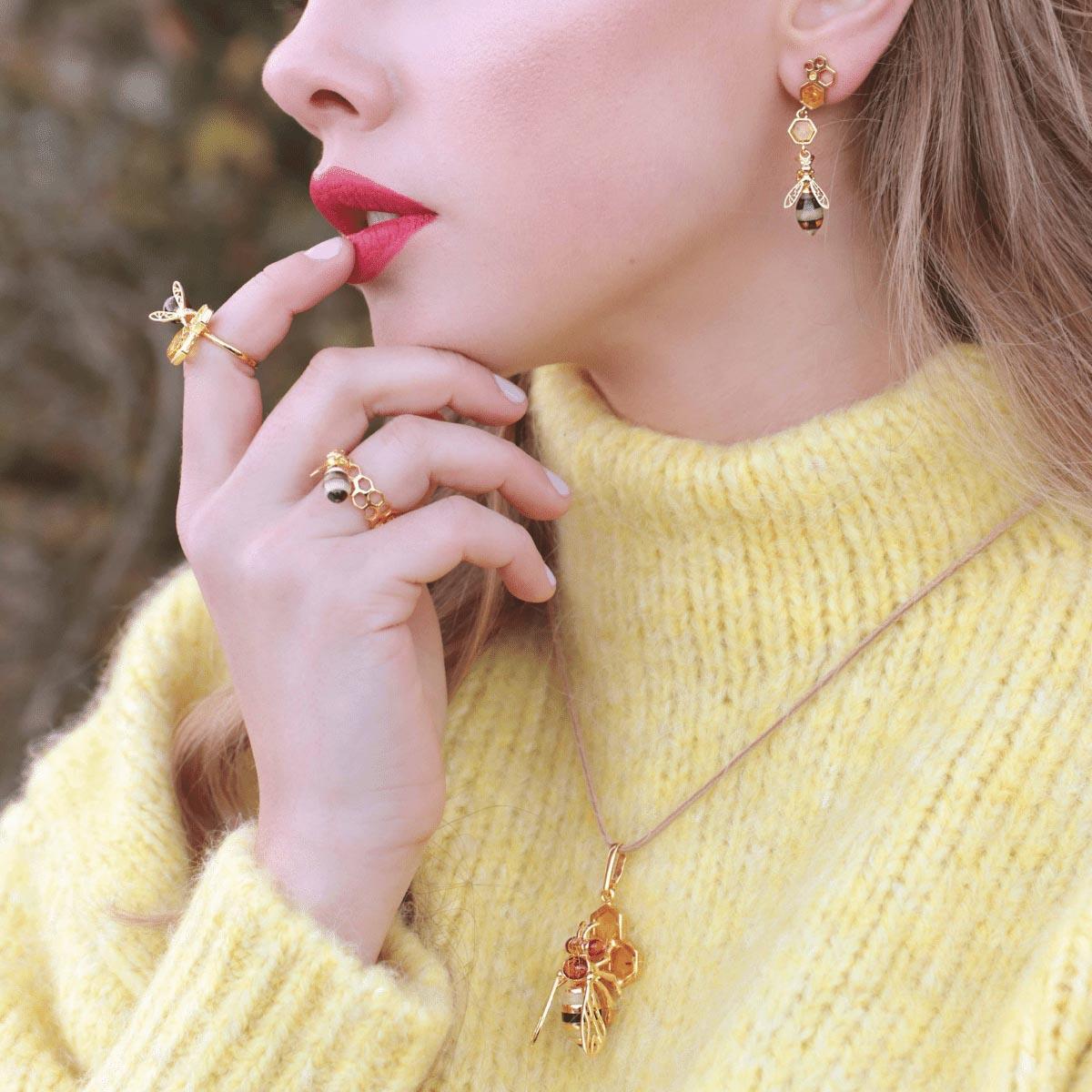 248,00 złKolczyki Gold Bees z kolekcji Amber Bee przedstawiają pszczoły zawieszone na plastrach miodu. To bardzo stylowa kompozycja łącząca w sobie pomysłowość, tradycję i jakość wykonania Pszczoły fantastycznie odwzorowane i wykonane ze srebra próby 925, pozłacane 24 karatowym złotem. Plasterki miodu to zatopione w ramkach bursztyny. Całość prezentuje się bardzo słodko i jednocześnie wytwornie.
