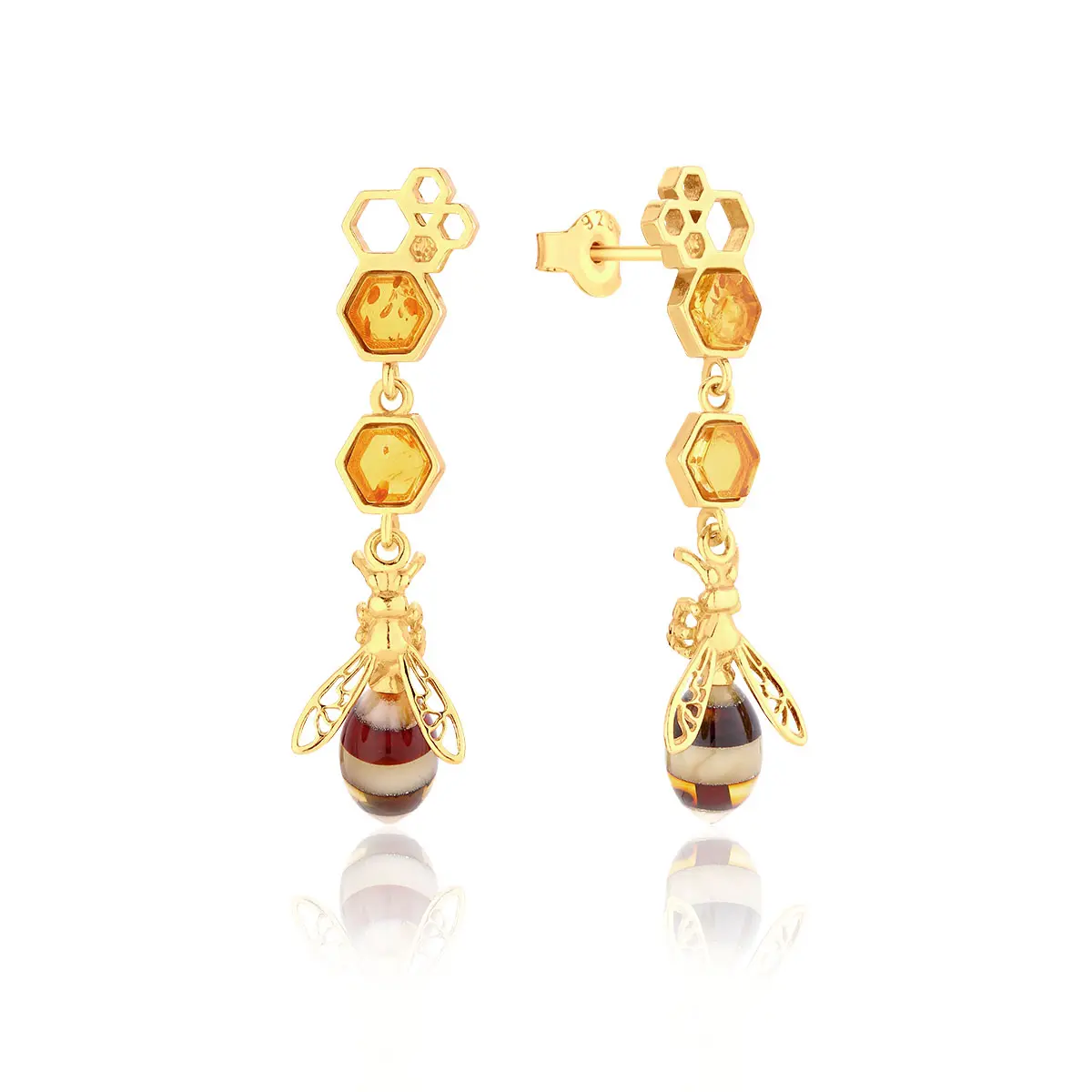 Kolczyki srebrne pozłacane pszczoły z bursztynem Gold Bees