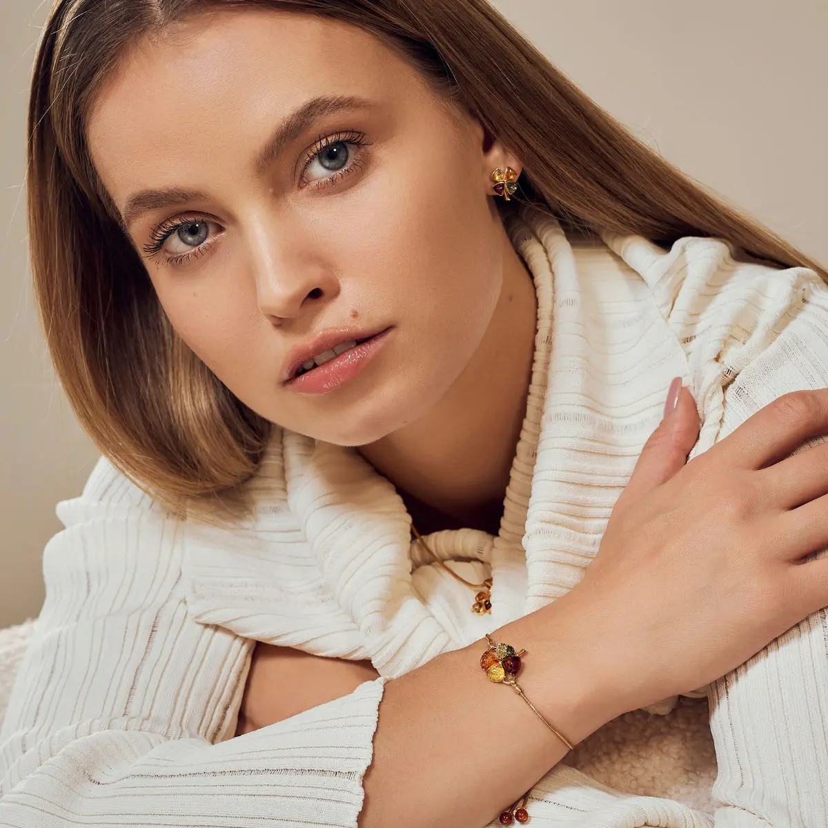 Bursztyn posiada niezwykle bogatą symbolikę. Uważa się, że jantar wzmacnia pewność siebie, a do tego pomaga człowiekowi w procesie samopoznania. Dzięki temu łatwiej jest odczytywać swoje emocje i potrzeby, a w konsekwencji tego żyć w zgodzie ze sobą. To bardzo ważne zwłaszcza we współczesnym świecie, w którym tak łatwo jest zapomnieć o dbaniu o swoje dobro. Nieprzypadkowo srebrne kolczyki na sztyfty łączą w sobie bursztyn z symbolem koniczyny, który jest zapowiedzią przyszłego szczęścia i powodzenia. Biżuteria z bursztynem posiada w sobie bardzo wiele uroku. Model został wykonany ze srebra próby 925 pozłacanego złotem.