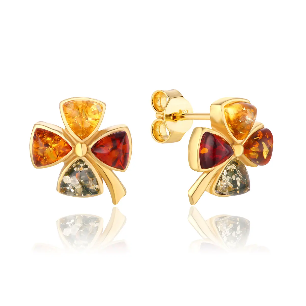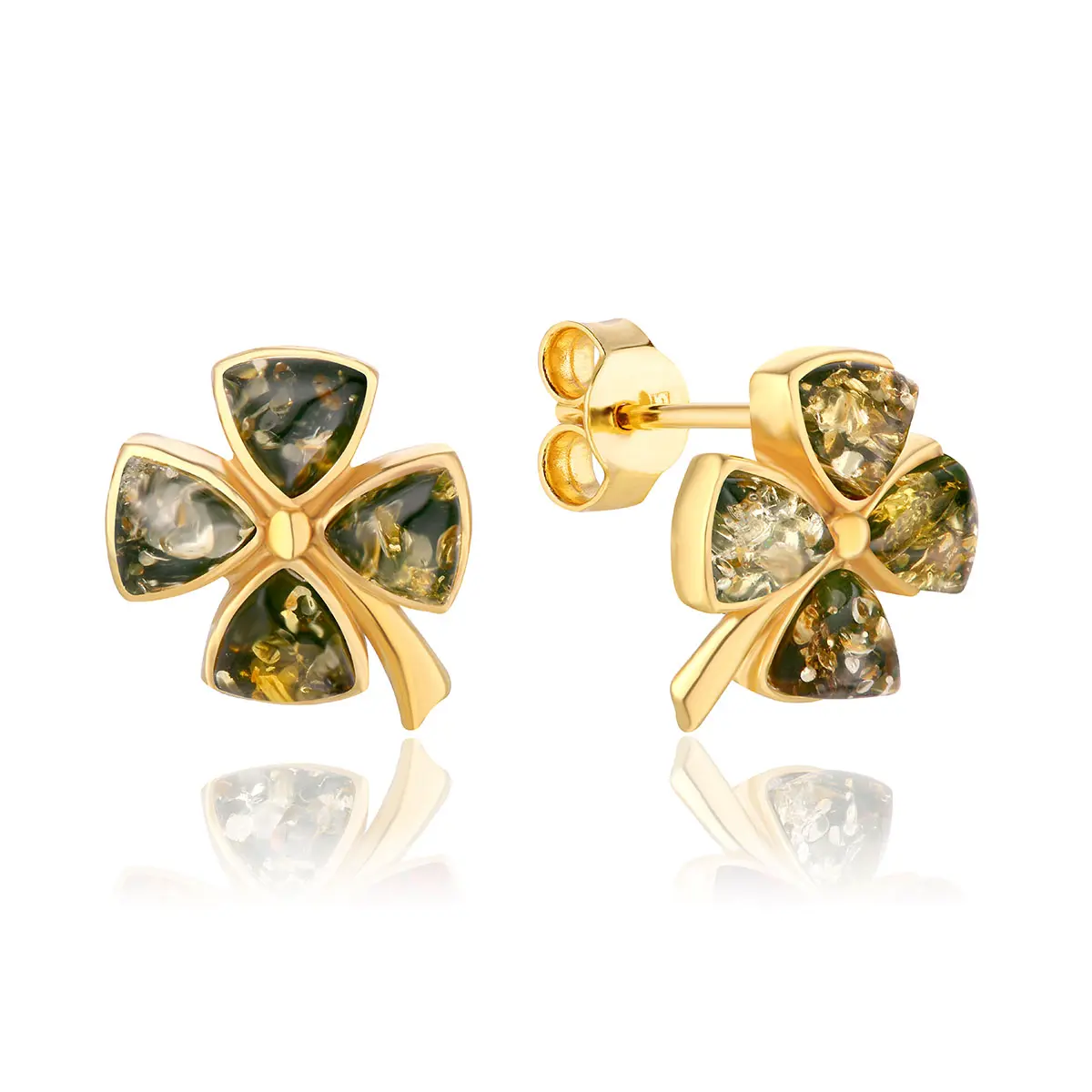 Kolczyki srebrne pozłacane koniczyny z bursztynem