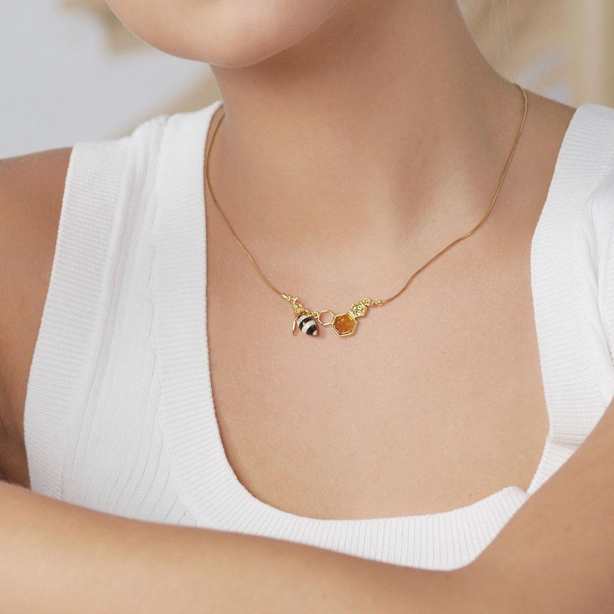 312,00 złPozłacany naszyjnik Queen Bee z pszczołą i z dodatkiem bursztynów. Naszyjnik z kolekcji Amber Bee to przykład połączenia nowoczesnych geometrycznych kształtów wraz z nawiązaniem do natury i tradycji. Biżuteria na szyję w tym stylu spodoba się na pewno paniom radosnym i lubiącym trochę słodkiego szaleństwa w życiu i w modzie.